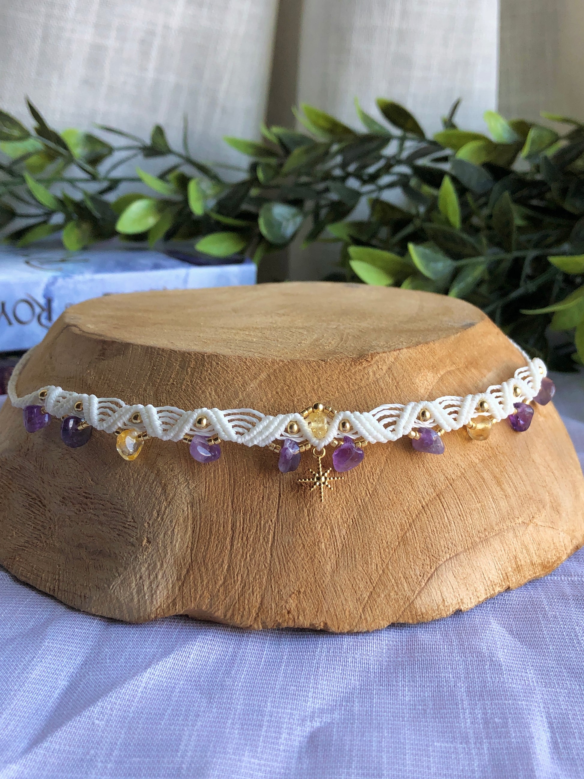 - pierres naturelles : améthyste (violet), citrine (jaune transparent)